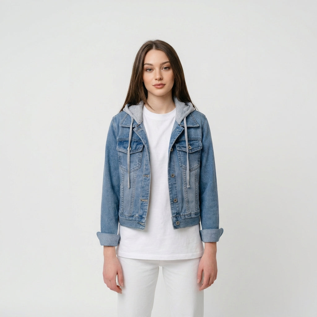 Blaue Denim Jacke mit Kapuze